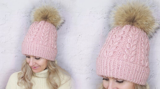 Женская шапка спицами с объемным узором листья и красивой резинкой подробный мастер класс