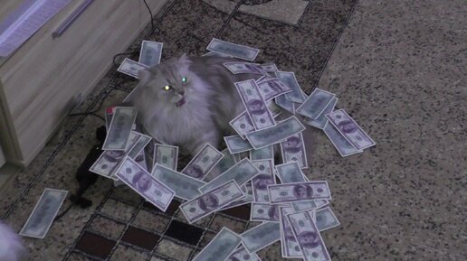 Кот сидит на куче денег