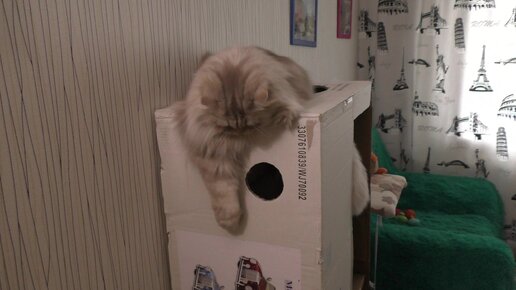 Кот и кошка играют в домике.