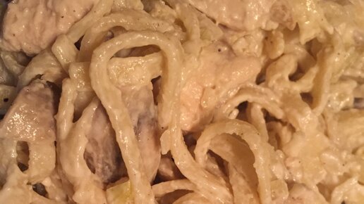 Делюсь очень вкусным и нежным рецептом жульена с грибами и курицей, с добавлением спагетти.