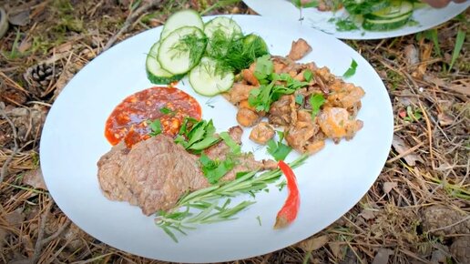 Шикарный обед в лесу. Жаренные грибы Лисички с мраморной говядиной. Еда в лесу самая лучшая