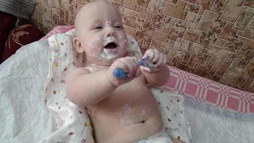 Папа кормит дочу. С папой можно все) Уляпалась вся)