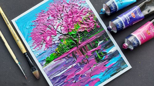 Рисуем просто / Цветущее дерево сакуры / Пошаговая картина акрилом