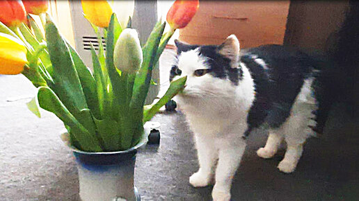 Кот и 8 Марта. Кот изучает тюльпаны, принесенные на 8 Марта