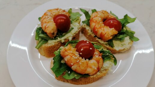 Брускетты с лангустинами, черри и рукколой
