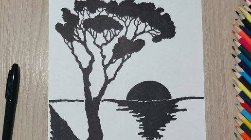 Поэтапное рисование. Дерево на берегу. Рисунок срисовка
