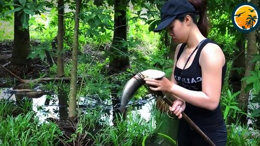 Девушка ходит по затопленному лесу и охотится гарпуном на рыбу и другую живность - на ужин будут деликатесы