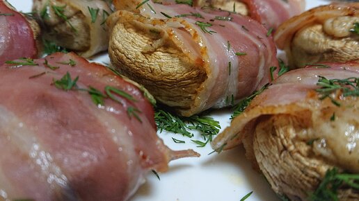 Фаршированные грибы в беконе.