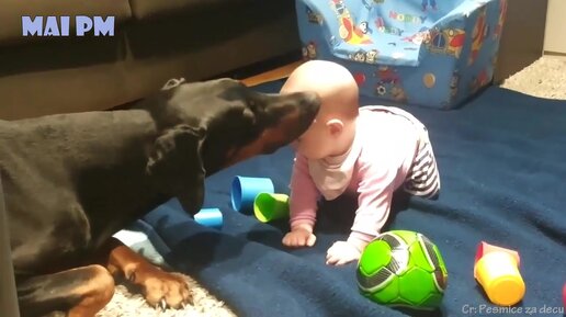 Доберман присматривает за малышом