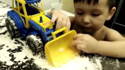 Мука вместо снега, лишь бы трактор работал. Трактор в руках малыша "работает по-настоящему"