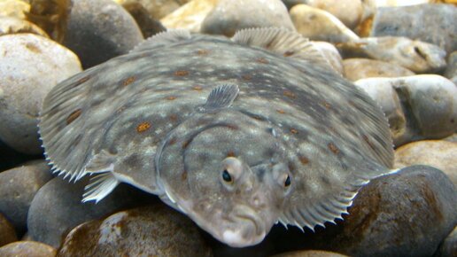 Помахивая хвостом, плывет приплюснутая Камбала.