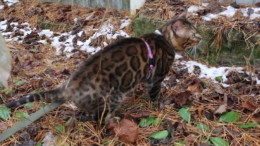 Бенгал в рыжих хвоинках и зеленых листочках