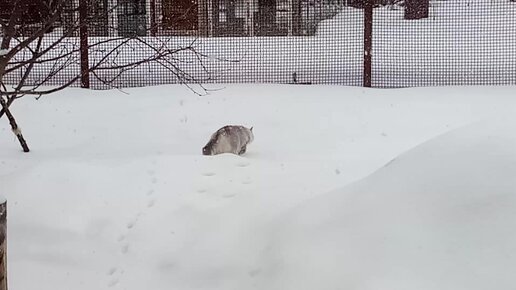 Киска Умка и во время снегопада идёт на улицу.