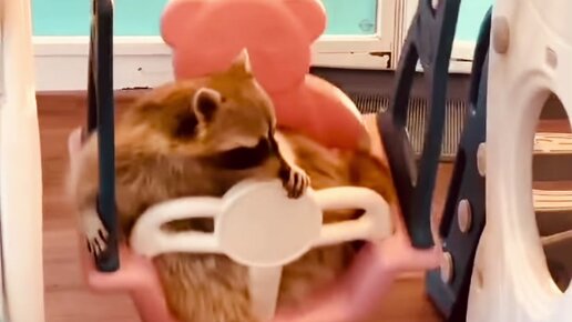 Вальяжный енот качался на качели, а затем хозяин подтолкнул его