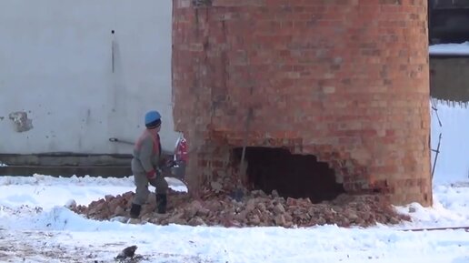 Опасный демонтаж кирпичной трубы