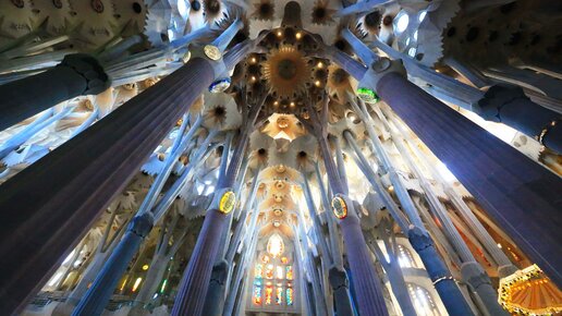 "Звёздный" интерьер Саграда Фамилии. Параболические своды, древовидные колонны, сияющие витражи