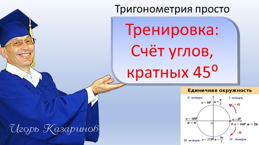 Тригонометрия: считаем углы, кратные 45 градусам на единичной окружности. В градусах и радианах.