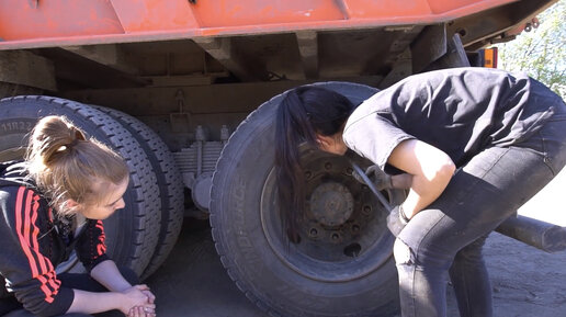 Хрупкие девушки, которые изо всех сил пытаются заменить колесо на камазе