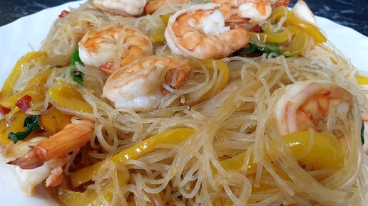Горячий салат фунчоза с креветками и овощами. Вкусный рецепт фунчозы.