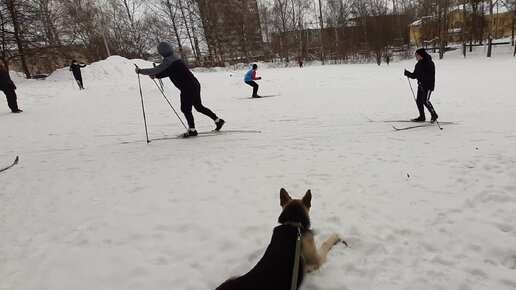 Пес и лыжники. Щенку Дарику очень хочется погоняться за лыжниками. Он думает, что они быстро едут, чтобы он их догонял