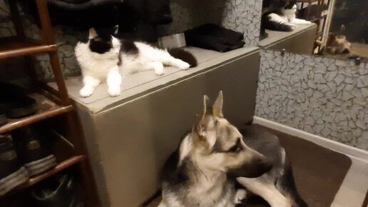 Пес и кот. Реакция на необычный звук. Собак, как человек, крутит головой, пытаясь понять, что происходит