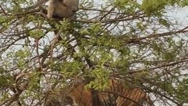 Голодный тигр забрался на дерево - хотел поймать обезьяну, но она обхитрила его