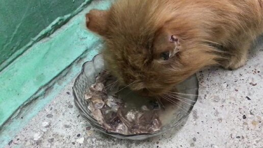 Уличный кот Рыжка пришел завтракать и ухо лечить