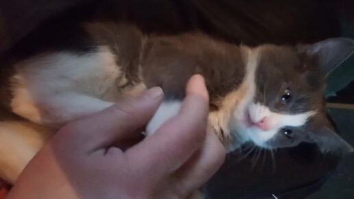 Неблагодарный дымчатый тигр терзает руку, пока его гладят