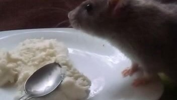 Милый крыс решил полакомится едой хозяйки