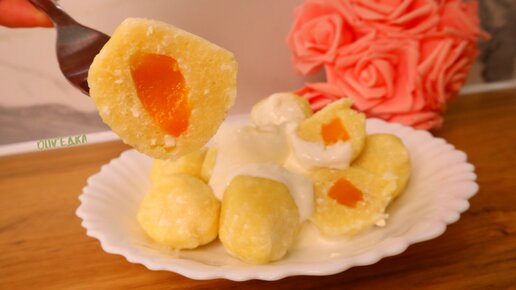 Положила в творожное тесто консервированный персик, скатала в шарик! Ленивые вареники, которые очень нравятся особенно детям