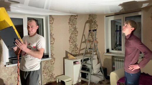 Натяжной потолок. Мастер натягивает глянцевый натяжной потолок. Ремонт в частном доме.