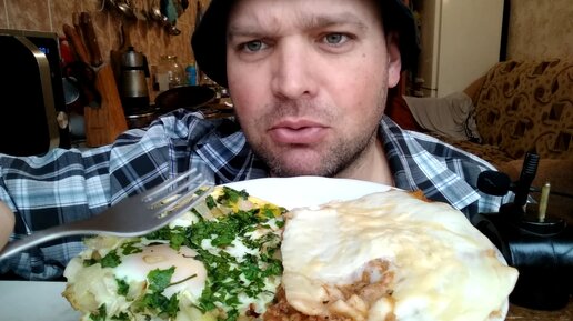 Кушаю лазанью и яичницу с луком.