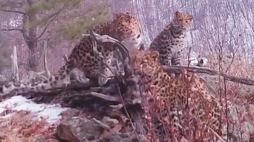 Уникальные кадры: вся семья леопардов изучает неопознанного зверя