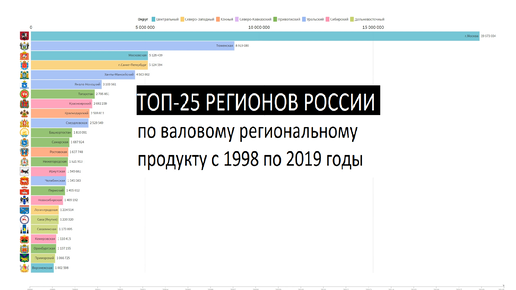 Топ-25 регионов России по валовому региональному продукту с 1998 по 2019 годы