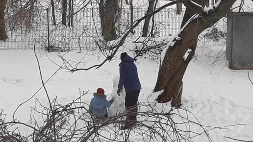 Папа с дочкой лепят снеговика, дети играют в снежки последним мартовским снегом