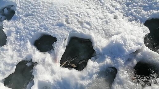 Рыба перестала клевать . Пошел искать окуня на середину озера. Воды по колено. Нашел старые лунки и рядом лежат брошенные окуни