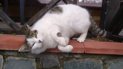 Весеннее пушистое чудо-кошка делает разминку у моря