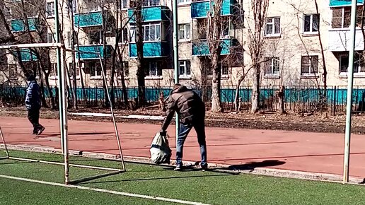 Собираем мусор после зимы, на школьном стадионе.