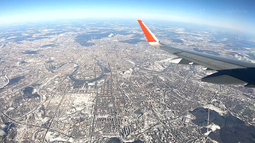 Пролетаем над заснеженной Москвой в ясный день. Москва Сити, Лужники, Университет, гостиница Украина.