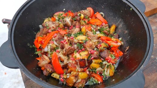 Показываю рецепт мяса с картошкой в казане на костре. Оджахури. Грузинская кухня.