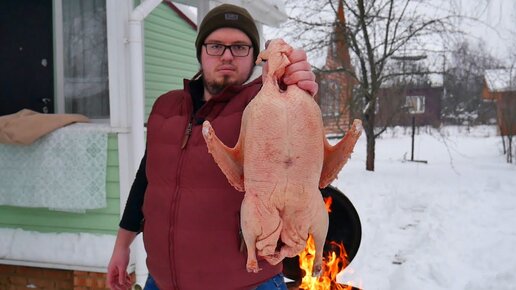 Как приготовить гуся целиком. Показываю как запечь мясо с картошкой на углях.