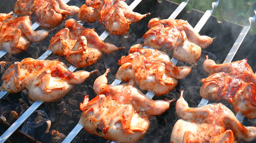 Шашлык из перепелов на мангале.