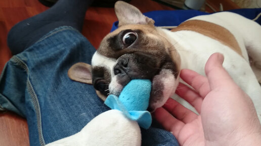 Французский бульдог Варя и ее любимые игрушки: плюшевый снеговик!