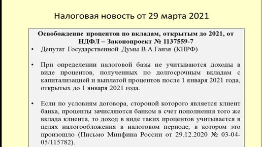 Освобождение от НДФЛ процентов по вкладам, открытым до 2021