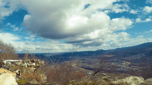 Пушистые облака неспешно плывут над рекой Белой и посёлком Каменномостский в Адыгее