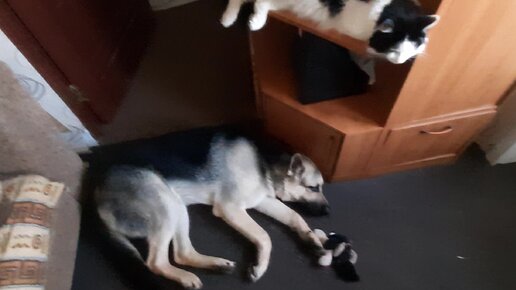 Мирно спящие домашние звери - пес и кот. Аттракцион, который встречается в нашем доме очень редко