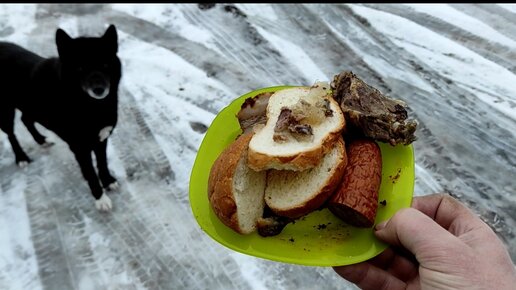 Колбаса, сало, хлеб и курица для бездомной собаки. Еда как в ресторане 🐕