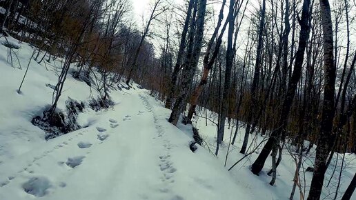 Включите звук, чтобы услышать этот чарующий хруст снега под ногами, пока я иду к адыгейской пещере Духан по лесной тропе в горах