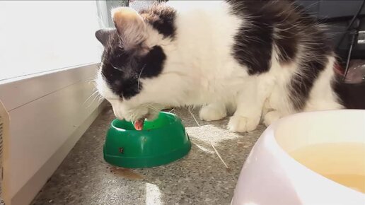 Кормление красивого котика. Кот очень ждет еды, смотрит с надеждой и, наконец, я его кормлю