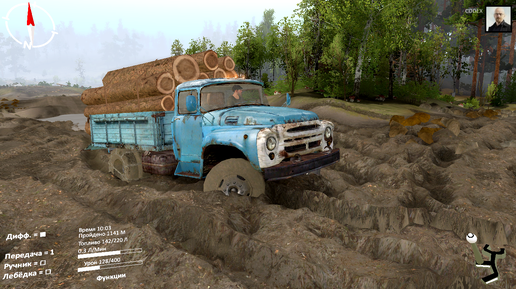 ЗИЛ 130 коротыш на цепях груженый бревнами на блокировки.Spintires.